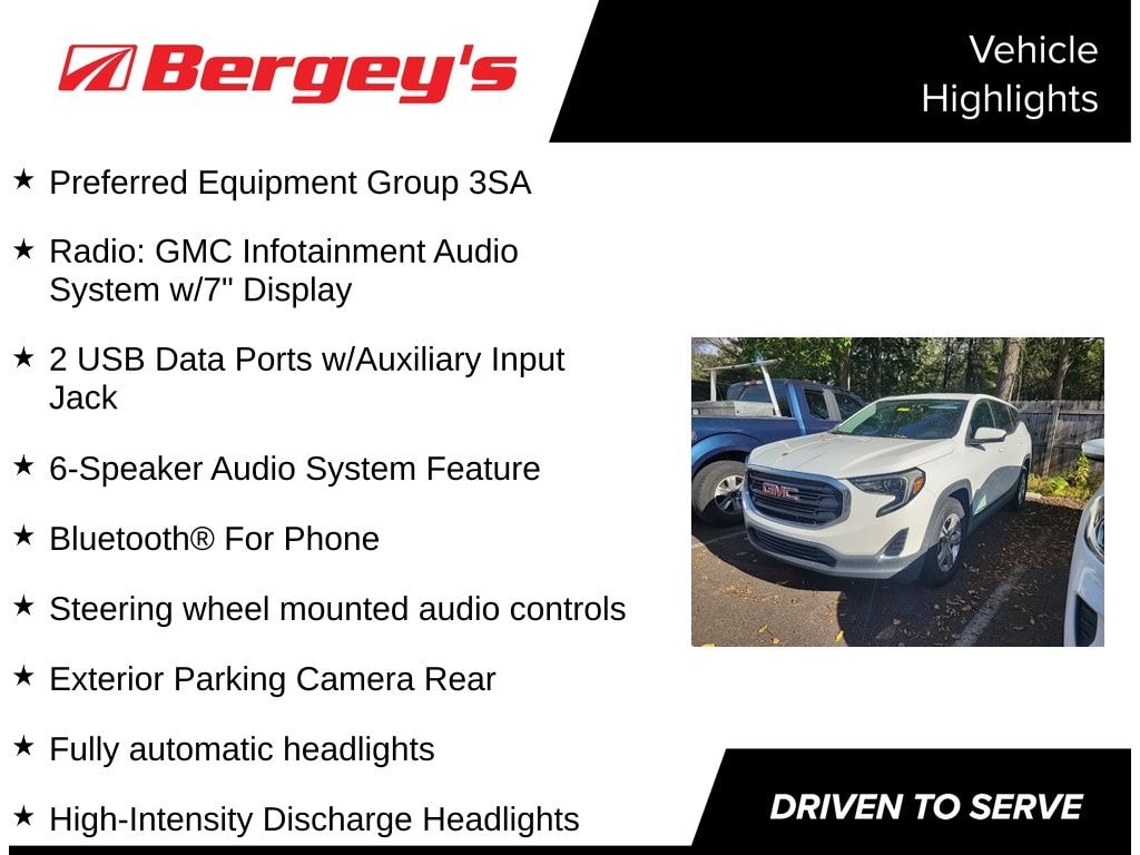 Clean CARFAX. Certified. Summit White 2018 GMC Terrain SLE FWD 9-Speed Automatic 1.5L DOHC 1.5L DOHC, 9-Speed Automatic, FWD, 2 USB Data Ports w/Auxiliary Input Jack, 6-Speaker Audio System Feature, Alloy wheels, Apple CarPlay/Android Auto, Bluetooth® For Phone, Exterior Parking Camera Rear, Fully automatic headlights, High-Intensity Discharge Headlights, Preferred Equipment Group 3SA, Radio: GMC Infotainment Audio System w/7" Display, Steering wheel mounted audio controls, Wheels: 17" x 7" Silver Painted Aluminum.