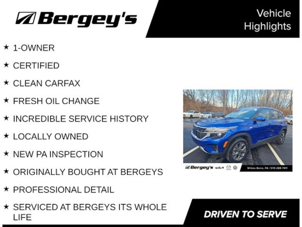 Certified. Neptune Blue 2024 Kia Seltos LX AWD CVT 2.0L I4 MPI 1-OWNER, CERTIFIED, CLEAN CARFAX, FRESH OIL CHANGE, INCREDIBLE SERVICE HISTORY, LOCALLY OWNED, NEW PA INSPECTION, ORIGINALLY BOUGHT AT BERGEYS, PROFESSIONAL DETAIL, SERVICED AT BERGEYS ITS WHOLE LIFE.