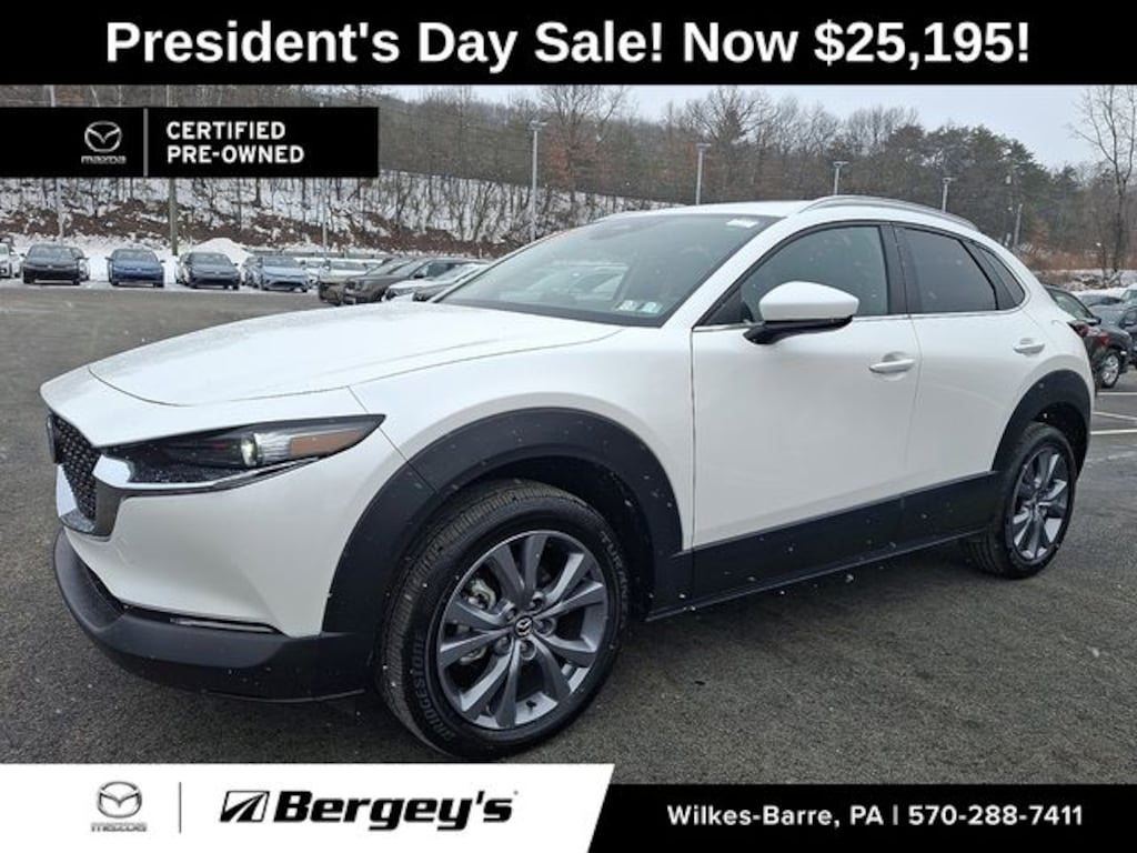 Certified. Snowflake White Pearl Mica 2025 Mazda CX-30 2.5 S Preferred Package AWD 6-Speed Automatic SKYACTIV® 2.5L 4-Cylinder DOHC 16V 1-OWNER, CERTIFIED, CLEAN CARFAX, FRESH OIL CHANGE, INCREDIBLE SERVICE HISTORY, LOCALLY OWNED, NEW PA INSPECTION, ORIGINALLY BOUGHT AT BERGEYS, PROFESSIONAL DETAIL, SERVICED AT BERGEYS ITS WHOLE LIFE.