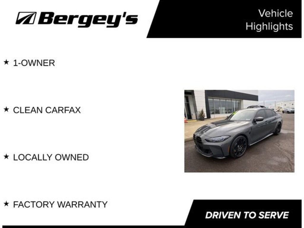 Experience the pinnacle of performance and luxury with this exceptional 2023 BMW M3 Competition. This stunning vehicle is a true testament to the brand's commitment to engineering excellence, offering a thrilling driving experience that will captivate your senses.Boasting an impressive array of features, this M3 Competition is the embodiment of power and sophistication. Key highlights include:- 1-Owner, Clean CARFAX, Locally Owned- Factory Warranty- M Carbon Exterior Package- M Driver's Package- Individual Dravit Grey Metallic Exterior- Executive Package with Remote Engine Start, Power Tailgate, BMW Head Up Display, and Heated Steering Wheel- ICON Adaptive LED Headlights with Laserlight- Carbon Fiber Trim- M Drive Professional- Parking Assistance Package with Parking Assistant Plus- Front Ventilated Seats- M Shadowline Lights- Wireless Device Charging- Drive RecorderPowered by a potent 3.0L I6 Turbocharged engine that delivers an exhilarating 503 horsepower, this M3 Competition is engineered to thrill. The 8-Speed Automatic Steptronic transmission and xDrive all-wheel-drive system provide seamless power delivery and exceptional handling, allowing you to conquer the road with confidence.Slip behind the wheel and experience the unparalleled craftsmanship that defines the BMW M3 Competition. The luxurious interior, adorned with premium materials and advanced technology, creates an environment that is both driver-focused and exceptionally comfortable. From the supportive M Sport seats to the intuitive BMW Curved Display, every detail has been meticulously designed to enhance your driving experience.Whether you're seeking a high-performance daily driver or a thrilling weekend companion, this 2023 BMW M3 Competition is the ultimate choice. With its striking appearance, uncompromising performance, and exceptional features, this vehicle is sure to captivate and impress. We invite you to schedule a test drive and discover the true essence of the BMW M3 Competition for yourself.