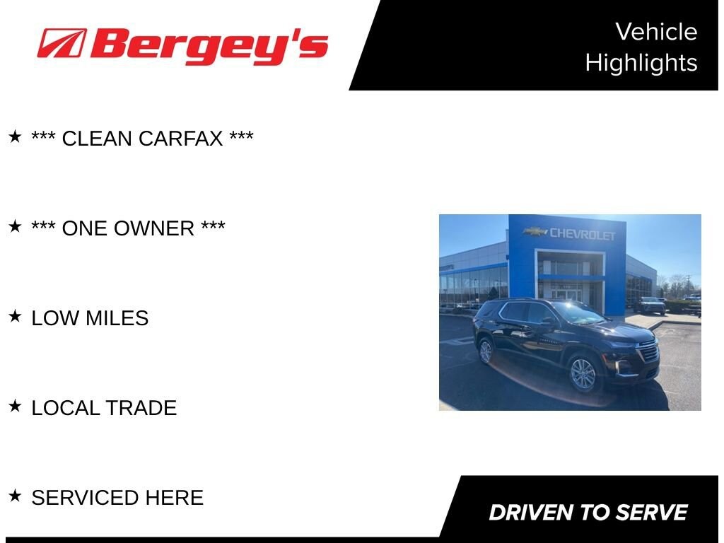 Elevate your driving experience with the 2023 Chevrolet Traverse LT 1LT. This stunning SUV boasts a commanding presence on the road, combining exceptional versatility, advanced technology, and a refined, sophisticated style that will turn heads wherever you go.- CLEAN CARFAX- ONE OWNER- LOW MILES- LOCAL TRADE- SERVICED HERE- LICENSE PLATE FRONT MOUNTING PACKAGEPowered by a robust 3.6L V6 SIDI VVT engine and paired with a smooth-shifting 9-Speed Automatic transmission, the Traverse LT 1LT delivers a dynamic and responsive driving experience, while the available All-Wheel Drive system ensures confident handling in any condition. With an impressive EPA-estimated 17 MPG in the city and 25 MPG on the highway, this SUV strikes the perfect balance between power and efficiency.Step inside the spacious and well-appointed cabin, where premium features like the Chevrolet Infotainment 3 Plus System, Apple CarPlay/Android Auto, and a 6-Speaker Audio System create an engaging and connected driving experience. The Traverse LT 1LT also boasts thoughtful amenities such as Dual-Zone Automatic Climate Control, Heated Front Seats, and a Power Driver's Seat, ensuring your comfort and convenience on every journey.This Traverse has been meticulously cared for and is now available as a Certified Pre-Owned vehicle, giving you the peace of mind of a thorough inspection, comprehensive warranty coverage, and the confidence of Chevrolet's commitment to quality. With its impressive combination of style, technology, and capability, the 2023 Chevrolet Traverse LT 1LT is the perfect SUV to elevate your driving experience.Discover the exceptional value and uncompromising quality of this Traverse LT 1LT. Contact us today to schedule a test drive and experience the difference for yourself. We're confident that once you get behind the wheel, you'll be captivated by the remarkable features and refined driving dynamics that make this SUV a standout in its class.