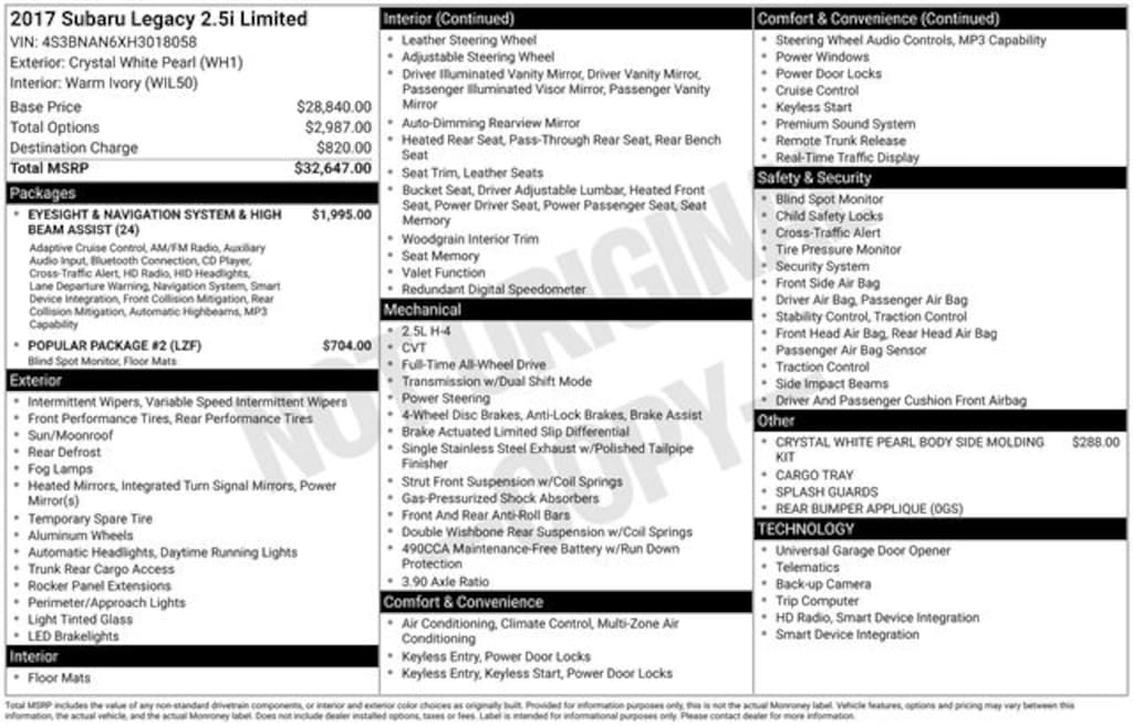 Crystal White Pearl 2017 Subaru Legacy 2.5i Limited AWD CVT Lineartronic 2.5L 4-Cylinder DOHC 16V