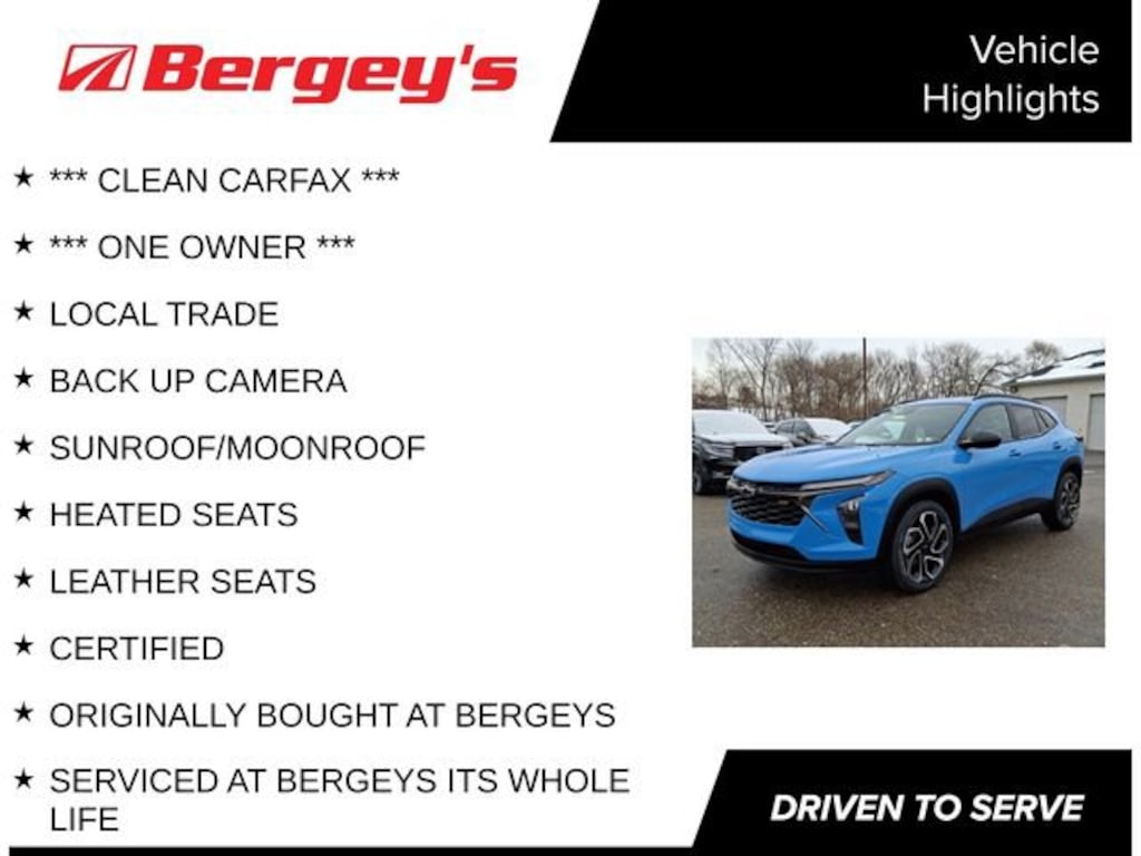 Recent Arrival! *** CLEAN CARFAX ***, *** ONE OWNER ***, LOCAL TRADE, BACK UP CAMERA, SUNROOF/MOONROOF, HEATED SEATS, LEATHER SEATS, CERTIFIED, ORIGINALLY BOUGHT AT BERGEYS, SERVICED AT BERGEYS ITS WHOLE LIFE. Certified. Certification Program Details: *6-Month/6,000-Mile Bumper-to-Bumper Limited Warranty*, whichever comes first, in addition to any remaining original factory Bumper-to-Bumper warranty. See participating dealer and warranty booklet for limited warranty eligibility and coverage details, including limitations and exclusions. *Except for non-GM vehicles in the State of California, where coverage will be provided by a vehicle service contract.28/32 City/Highway MPGAwards:* Car and Driver 10 BestCar and Driver, January 2017.2024 Fountain Blue Chevrolet Trax FWD 1.2L Ecotec Turbo DOHC DI w/VVT 6-Speed Automatic