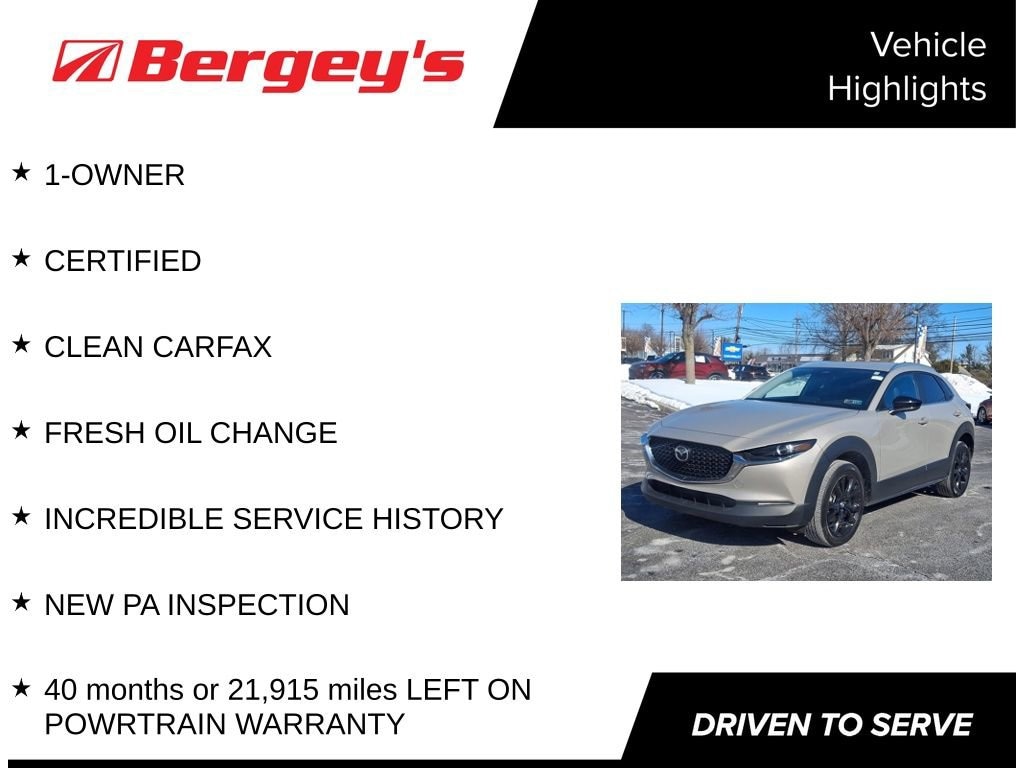 This CX-30 is a certified pre-owned vehicle, meaning it has undergone a rigorous inspection and reconditioning process to ensure exceptional quality and reliability. With a comprehensive warranty and a clean CARFAX history, you can purchase this SUV with confidence, knowing that it has been meticulously maintained and is ready to provide you with years of enjoyment.